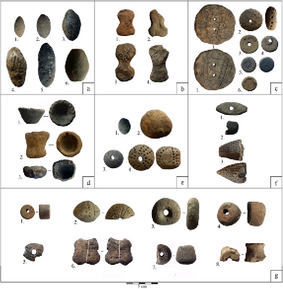 In the cited excavations reports and subsequent archaeological articles (Grigalavičienė, 1986a, p. 75; Grigalavičienė, 1986b, p. 119; Kulikauskienė-Volkaitė, 1986 p. 40–41; Luchtanas, 1992, p. 69, 73), these Baltic figurines are primarily associated with household purposes. For example, miniature discs without a hole have been described as unfinished spindles. Smaller, pierced, and marked spheres were defined as spindles. Larger discs and spheres have been identified as weights for weaving looms and fishing nets, while biconoid-shaped items and concaves are also considered weights for fishing nets. Miniature vessels have been interpreted as salt or medicine containers, lamps, or children’s toys. Tools and marked spheres are defined as objects used in magical rituals. Additionally, archaeologists conventionally identify artefacts like those presented in Fig. 1 as gaming objects. Nevertheless, nearly all of these figurines are made from clay, with the exception of one made of stone (Fig. 1, f (1)), and their dimensions range approximately from 2 to 8 centimeters. Given these characteristics, it can be questioned whether at least some of the clay figurines were unsuitable for pragmatical purposes such as weighing or sinking.