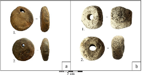 2 pav. a – moliniai galimi pasvarai, b – akmeniniai galimi pasvarai. a (1, 2) rasti Nevieriškės įtvirtintoje gyvenvietėje; b (1, 2) – Narkūnų įtvirtintoje gyvenvietėje. Šie radiniai saugomi Lietuvos nacionaliniame muziejuje. Nuotraukos autoriaus.