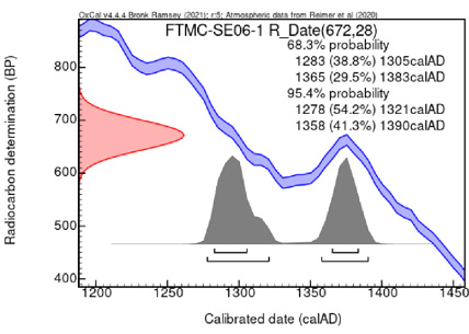 Iš duobės buvo paimti keli anglies mėginiai radiokarbono datavimui (AMS 14C, mėginio Nr. FTMC-SE06-1)19. Gauta data: 672 ± 28 BP, kalibruota data 1278–1390 m. (95,4 % tikimybė) (5 pav.). Tyrimas rodo, kad aptiktas objektas gali būti datuojamas XIV a., tačiau čia susiduriame su radiokarbono metodo problema – vadinamuoju vieno amžiaus trukmės kalibravimo kreivės suplokštėjimu (plačiau žr. Kuncevičius ir kt., 2015, p. 52). Viduramžiais šis suplokštėjimas apima visą XIV a. (nuo 1295 iki 1400 m.). Taip gautas rezultatas vienodu patikimumu rodo ir XIV a. pirmą pusę, ir jo antrą pusę. Todėl mūsų atveju tegalima konstatuoti, kad struktūra (ūkinis pastatas?) tikrai stovėjo jau XIV a.