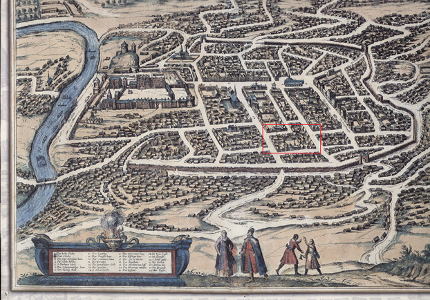 1. Vilniaus planas iš Georgo Brauno „Pasaulio miestų atlaso“, 1581 m., su pažymėta ansamblio vieta.