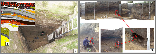 3 pav. 1, 2 – tyrimai už Medžybižo lietuviškosios pilies sienos (5 šurfas, 2018 m., gylis 6,2 m). 3 – stratigrafinių profilių chronologiniai žymikliai (2022 m.) (V. Vietrovo nuotr.).