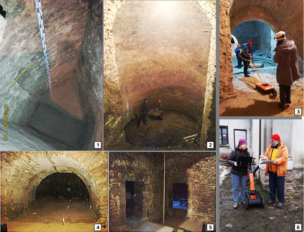 The boundaries of excavations are indicated in red in Fig. 11. In the sector of anomaly 1, a rectangular arched masonry building with dimensions of 6.4×5.4×2.8 m was uncovered. The final point of research was the cellar of the Oficyna. It was mentioned in the Inventories of Medzhybizh Castle dating back to the 18th century. In 2022, archaeological stripping and conservation of the object was realized.