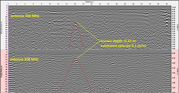 Only the 300 MHz radargrams were considered because such a frequency provided sufficient penetration depth compared to the 700 MHz radargrams. The processing flow-chart consists of the following steps: (I) zero level setting: to determine the depth correctly, it is necessary to match the beginning of the depth scale with a certain point of the direct pulse (e.g., the maximum amplitude); (II) wavelet filtering to suppress effectively low-frequency fluctuations and high-frequency noise; (II) the windowed background removal tool subtracts an averaged trace from each trace of the profile, with the width of the window for averaging specified by the total number of traces; (III) manual gain, to adjust the acquisition gain function and enhance the visibility of deeper anomalies. By using the Planner software, the radargrams were subsequently merged into three-dimensional volumes and visualized in various ways to enhance the spatial correlations of anomalies of interest. The average electromagnetic wave velocity was estimated as 0.1 m/ns from the hyperbolic adjustments of the diffraction hyperbolas of the known water pipe located at the site (Fig. 7).