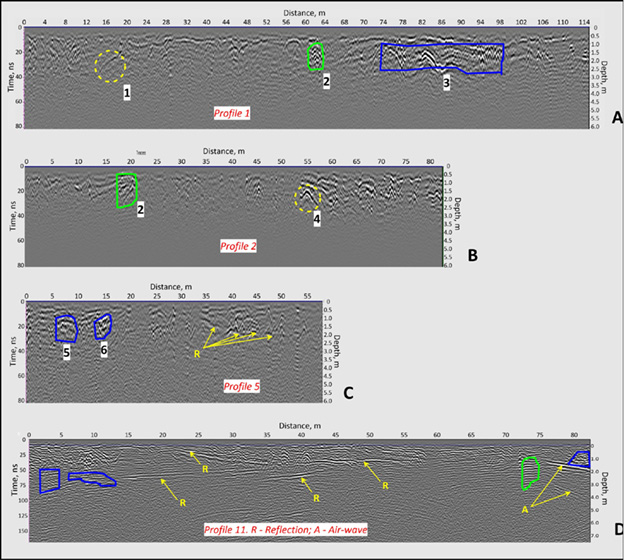 In Figure 9, a–d, the reflections, which could be attributed to the shallow stone structures, are identified because there is a significant difference in dielectric permittivity between the soil and the stones. Radargram from Profiles 1 and 2 (Fig. 9 A,B) revealed responses marked 1 and 4 originating from ‘other objects’, which were recommended for excavation.