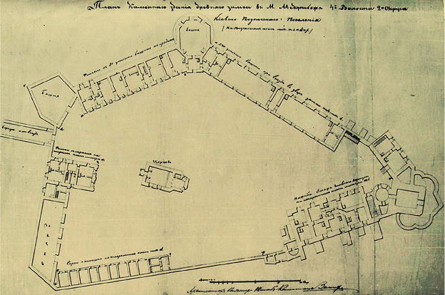 Fig. 1. Plan of Medzhybizh Castle, 19th century. Retrieved from the Album of Archival Materials on the Architectural Monument of the 13th–19th Centuries. Kyiv, 1970, p. 6.