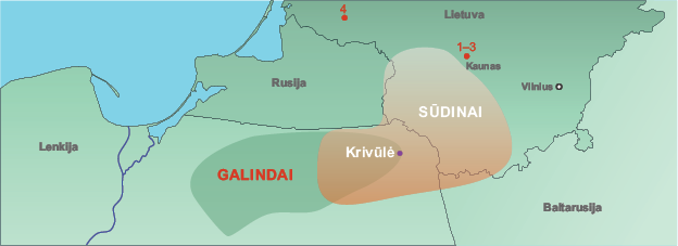 Fig. 8. Flat cemeteries from the Amber Road period (1st–3rd centuries AD) with material comparable to that of the Sudovian Krivūlė burial monument (1st–3rd centuries AD): 1. Marvelė, Kaunas District, excavations 1991–1997 by A. Astrauskas, late 1st century – 3rd century; 2. Sargėnai, Kaunas City, excavations 1938–1941 by J. Puzinas, 1st–2nd centuries; 3. Veršvai, Kaunas City, excavations 1938, 1939–1941 by J. Puzinas and P. Baleniūnas, 1st–4th centuries; 4. Dauglaukis, Tauragė District, excavations 1983–1986, 1987–1995: J. Balčiūnas (1983), E. Jovaiša (1984–1986, 1988–1991, 1993–1995), A. Malonaitis (1992), late 1st century – mid-3rd century. Prepared by E. Jovaiša, 2025.