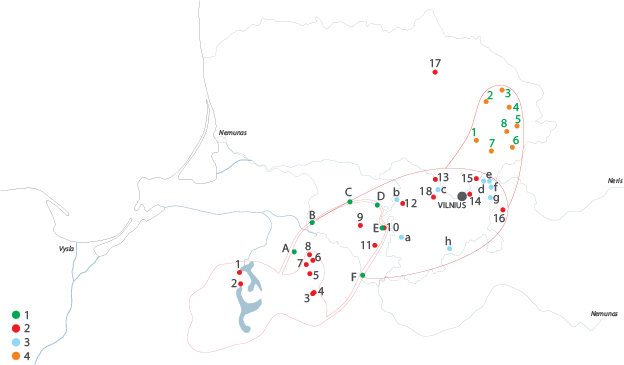 Fig. 13. The spread of the Galindian culture into Užnemunė and into the territory of the Corded Ware Culture. 1. Sites reflecting Galindian influence in Užnemunė according to G. Grižas and A. Bitner-Wróblewska: A. Rominten (Rominta, Poland); B. Stanaičiai; C. Nendriniai; D. Pažarstis; E. Bakšiai; F. Zapsė.). 2. Distribution of wristlet bracelets according to M. Michelbertas: 1. Bogačevo-Kula (Poland); 2. Tuchlin (Poland); 3. Bargław (Poland); 4. Męta (Poland); 5. Raczkos (Poland); 6. Krivūlė (Szwajcaria, Poland); 7. Plocičnas (Poland); 8. Żywa Woda (Poland); 9. Radastai-Aleknonys (Lithuania); 10. Bakšiai (Lithuania); 11. Seiliūnai (Lithuania); 12. Medžionys (Lithuania); 13. Semeniškės (Lithuania); 14. Kairėnai (Lithuania); 15. Pakrauglė (Lithuania); 16. Slobodka (Belarus); 17. Didžprūdėliai (Lithuania); Eikotiškės (added by A. Bliujienė, Lithuania). 3. Barrows with identical burial customs within the wristlet bracelet distribution area according to V. Vaitkevičius and E. Jovaiša: a. Slabadėlė; b. Migonys; c. Padvariškiai; d. Pakalniai; e. Varapniškės; f. Pilviškės; g. Santaka; h. Verseka. 4. Barrows from the Early Iron Age located further north, outside the wristlet bracelet distribution area, according to E. Jovaiša: 1. Rudesa; 2. Žadavainiai; 3. Eikotiškės; 4. Rokėnai; 5. Cegelnė; 6. Mėžionys; 7. Graužiniai; 8. Žeimenys. Compiled by E. Jovaiša, 2013, 2025.