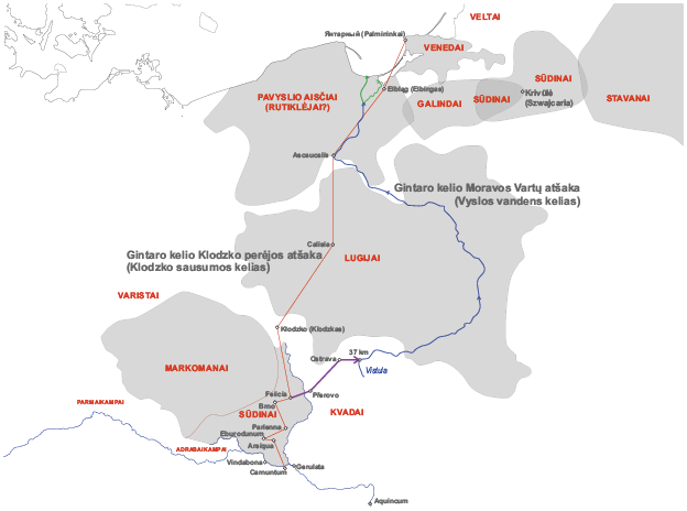 Vindabona, ypač Karnuntas, yra pripažinti Gintaro prekybos miestai. Į juos ir dar į Lentiją (Lentia, dab. Linz, Austrija) ir Akvinką (Aquincum, dab. Budapeštas, Vengrija) vedė Gintaro keliai iš gintaringų Baltijos jūros pakrančių. Daugiametė įvairių kraštų tyrinėtojų išvada sako, kad bene svarbiausias kelias iš aisčių (vakarų baltų) vedė į Karnuntą, buvusį netoli Moravos žiočių, Vakarų Moravijos ir Panonijos pasienyje. Iš čia vokiečių tyrinėtojai veda ir vadinamuosius Gintaro kelio miestus, kurie nustatyti remiantis Ptolemajo duomenimis ir šiuolaikiniais istoriniais bei archeologiniais tyrinėjimais. Tad jais remdamiesi nutieskime Gintaro kelią iš Baltijos Aistmarių iki Karnunto (žr. 5 pav.). Tryliktuoju skaitmeniu pažymėtas kelias eina nuo Palmininkų Sembos pusiasalio šiaurės vakaruose, bet Romos pirklių kelias, persikėlus per Dunojų, vedė į Arsikvą, Eburoduną, Parieną, Brno. Paskutinis Gintaro kelio miestas netolimoje Dunojaus aplinkoje buvo Felicija arba Vyškovas. Kaip dabar galima suprasti, Felicija buvo svarbi kryžkelė Gintaro kelių sistemoje. Sudetų ir Karpatų kalnų ypatumai diktavo savo sąlygas ir kelius į šiaurę bei šiaurės rytus atvėrė dviejose perėjose. Pirmoji – vadinamoji Klodzko (Klodzk, Lenkija) – perėja Sudetų kalnų aplinkoje vedė į Aistmarių pietinę pakrantę per Kališą (Calisia, Kalisz), Askaukalį (Ascaucalis, Bydgoszcz arba Osielsko) iki Elbingo įlankos Aistmarėse.