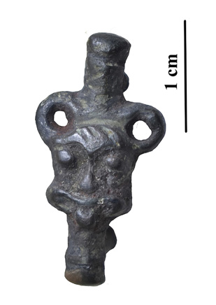 Fig. 2. One of the most remarkable finds from the excavation at T. Kosciuška St. 1 – decorative mount dated to the 14th century depicting a lion (?) with its tongue sticking out (photo by L. Banionytė).