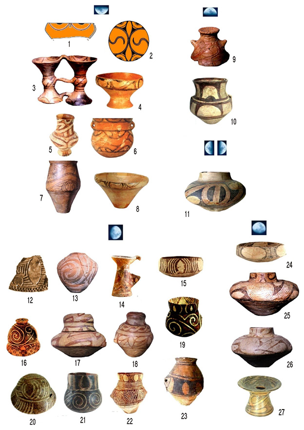 In general, the ornamentation of Cucuteni–Trypillia is characterized by a lot of options for combining moon symbols into ideograms from the signs moon disc, moon crescent, semicircle-crescent, gibbous (fig. 2; fig. 3). In the painted ornamentation from stages Cucuteni B–Trypillia B II, up to the beginning of C II, lunar symbolism is represented by a large number of different moon signs in different phases and their combination with each other and other signs. Due to such a combination, various fantastic sacred images were reproduced.