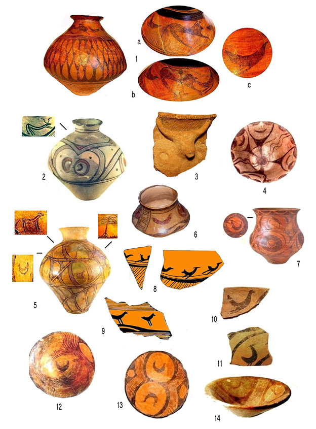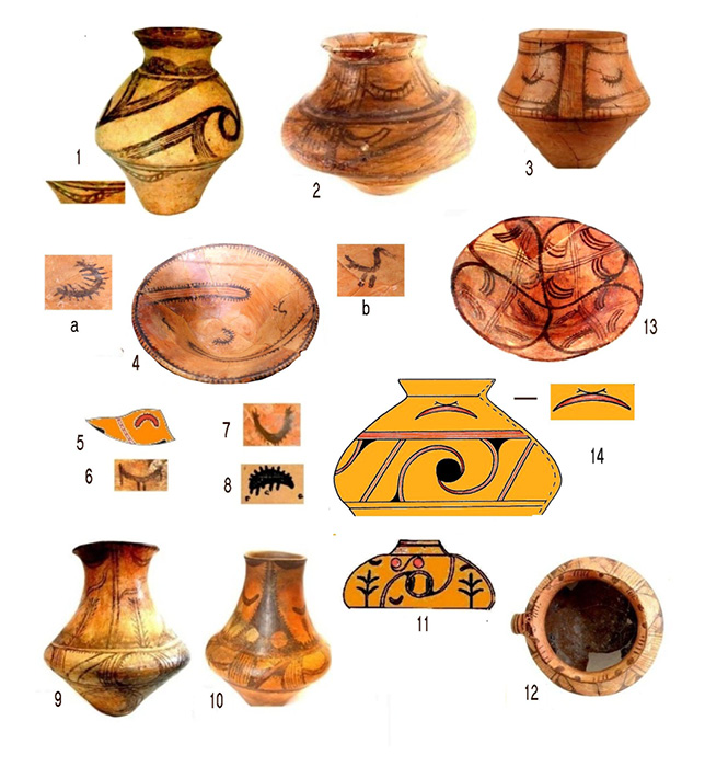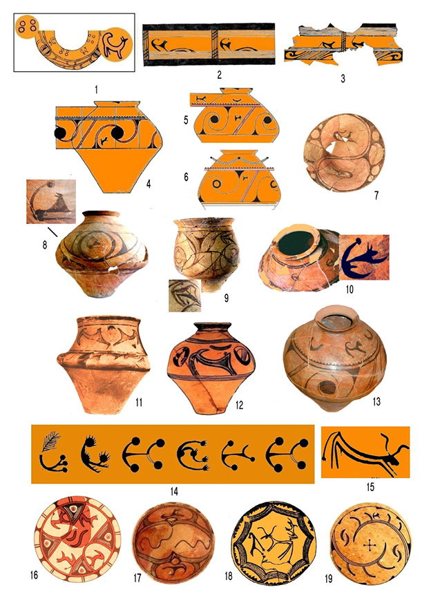 Special attention is drawn to compositions that include lunar ideograms. In the upper tier of the painting on a sphero-conical vessel, a scene with lunar birds and a lunar dog is depicted (fig. 6: 1). A similar, but painfully simple plot involving a lunar bird and a dog can be seen on a cup from the settlement of Bodeşti–Cetăţuia Frumuşica, where the image is repeated twice, separated by a vertical metope. A bird and a dog are depicted above an inverted semicircle-crescent symbol (fig. 6: 6). On a bowl the pictographic image consists of two schematic hairy snakes moving towards each other, between the snakes are a hairy crescent moon and a lunar bird (fig. 8: 4).