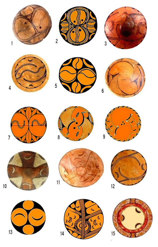 Such symbols, as circles – full moon, ovals – waxing gibbous and waning gibbous and circles – dominate in compositions on ceramics with deep decoration. Often, all lunar symbols appear as elements of some ornamental composition. Opposite moon crescents – waxing crescent and waning crescent – flank the full moon (fig. 3: 10–11). There are also combinations of the Full Moon symbol and horizontal crescents (fig. 3: 5–7). There are combinations of the symbols of the snake and the Full Moon, which probably reproduces the fantastic sacred character of the Moon Snake. These Moon Snakes are often depicted in pairs.