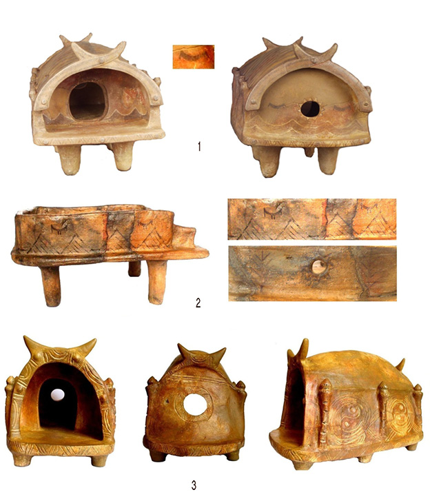 Fig. 9. Lunar symbolism on ceramic models of buildings (temples): “PLATAR” collection. (After: 1–3 – Videiko 2004).
