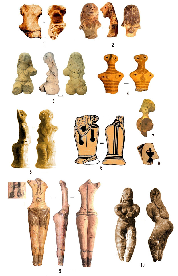 Fig. 10. Figures of the Moon Goddess: 1 – Maidanetske; 2, 4 – Volodymyrivka; 3, 5 – Sushkivka; 6 – Petreni; 7 – Kosteşti IV; 8 – Brinzeni III; 9 – Lomachyntsi-Vyshneva; 10 – Krynychky. (After: 1–6, 9–10 – Burdo 2014; 7 – Markevich 1985; 8 – Markevich 1981).