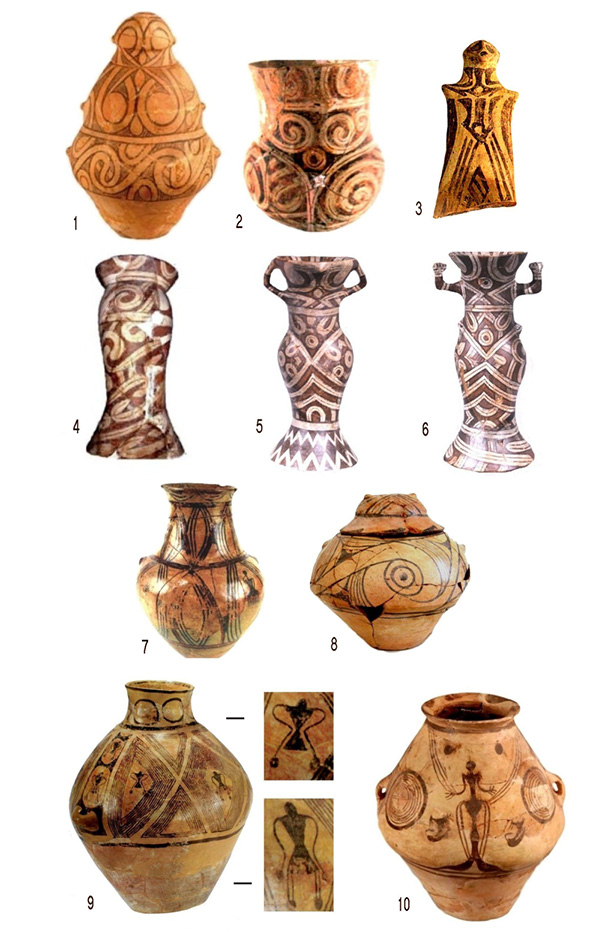 In rare cases, the white moon disc (fig. 1: ІІ, 15) dominates the ornamental composition. On the anthropomorphic stand (fig. 11: 4) and anthropomorphic vessels, the red moon disc is placed in the region of the womb (fig. 11: 2, 5–6) ), and on the two female shaped vessels also in the center on the chest (fig. 11: 2, 5–6).