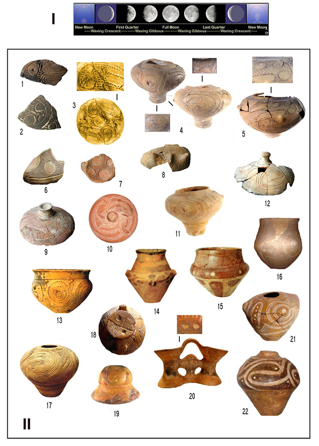 1 pav. I – mėnulio fazės; II – mėnulio simboliai, įrėžti Kukutenio-Tripolės keramikoje:1–3 – Bernachivka; 4, 6–7, 9, 12 – Oleksandrivka; 5, 11 – Tymkove; 8 – Slobidka-Zakhidna; 10, 14 – Poduri-Dialul Gindaru; 13 – Berezivska GES; 15–16 – Cucuteni – Cetăţuia; 17–19 – A kultūra pagal V. Khvoika; 20 – Kolomyitsiv Yar; 21 – Vesely Kut; 22 – Volodymyrivka grupė. (Pagal: 1–2 – Burdo 2001–2002; 3–3, 4, 9, 12, 21 – Burdo 2011; 10, 14 – Dumitroaia at all 2005; 16 – Petrescu-Dîmboviţa at all 2004; 17–20 – Burdo 2010; 21 – Burdo 2011)