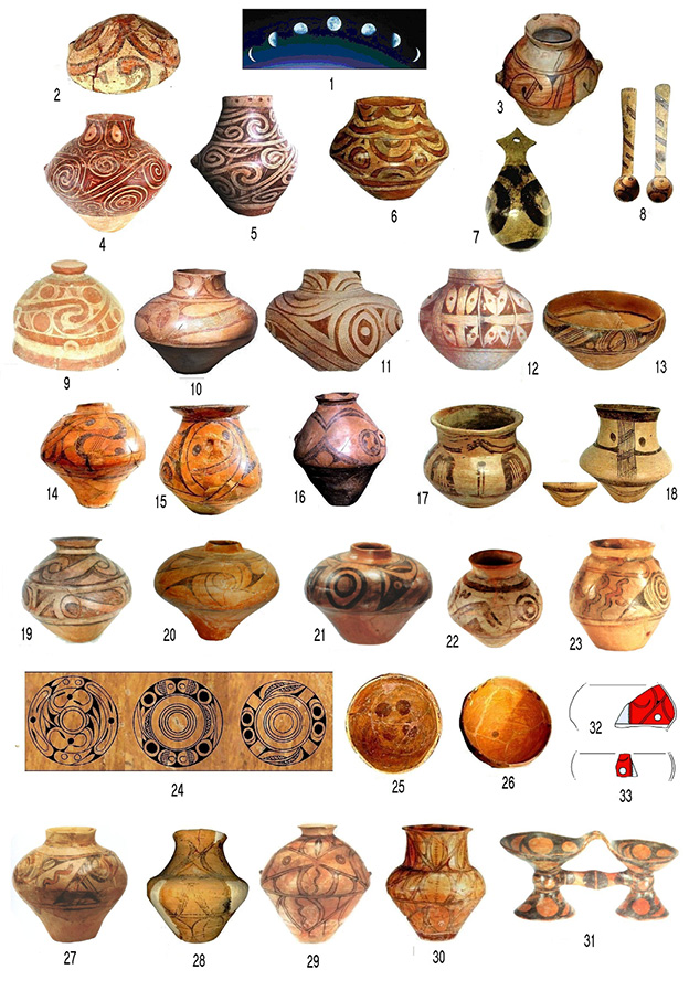 2 pav. Mėnulio simboliai, išpiešti Kukutenio-Tripolės keramikoje: I – mėnulio fazės; 2, 8 – Ariuşd; 3 – Verteba І; 4 – Dumeşti; 5 – Cucuteni А–Trypillia В І; 6 – Mărgineni-Cetăţuia; 7, 13 – Poduri-Dialul Gindaru; 9 – Bodeşti; 10 – Cucuteni АВ–Trypillia ВІ-ВІІ; 11–12 – A kultūra pagal V. Khvoika; 14–15 – Trypillia В ІІ; 16 – Trypillia С І; 17 – Cucuteni-Cetăţuia; 18 – Poduri-Dialul Gindaru; 18, 30 – Hancauti; 19 – Ghelăeşti; 20 – Glavan I; 21 – Piaţra Şoimului; 22–23, 27 – Valea Lupului; 24 – Tomashivka grupės keramikos puošyba iš viršaus; 25 – Tomashivka grupė; 26 – Maidanetske; 28 – Brinzeni III; 29 – Vărvăreuca XV; 31 – Ghelăeşti; 32–33 – Verteba ІІ. (Pagal: 2, 8, 19–20, 29–31 – Lazarovici at all 2009; 3, 11–12 – Burdo, 2010; 4, 6–9, 13 – Lazarovici at all 2009; 17 – Petrescu-Dîmboviţa at all 2004; 18 – Dumitroaia at all 2005; 24 – Tkachuk, Melnyk 2005; 32–33 – Tkachuk 2013)