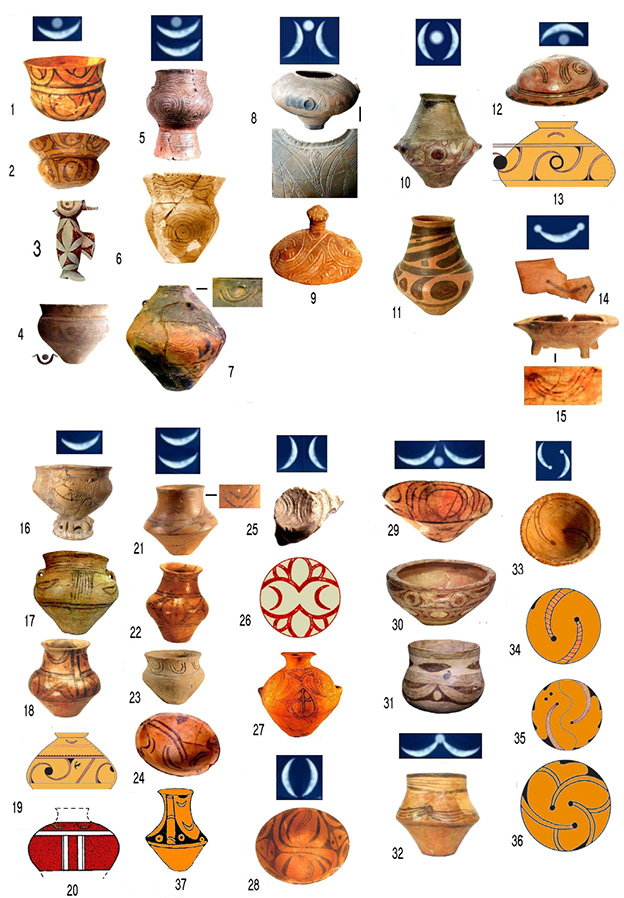 3 pav. Mėnulio simbolių deriniai: pilnatis ir pusmėnuliai: 1 – Rădultnii Vechi II; 2 – Vesely Kut; 3 – A kultūra pagal V. Khvoika; 4, 6 – Grebeni; 5 – Trypillia В І; 7, 23 – Kolomyischyna І; 8 – Oleksandrivka; 9, 16 – Berezivska GES; 10 – Tărgu Frumos; 11 – Truşeşti-Tugueta; 12 – Valea Lupului; 13, 19, 34–36 – Werteba І; 14 – Cucuteni-Cetăţuia; 15 – Glavan I; 20 – Werteba ІІ; 21 – Cherkasiv Sad II; 18, 22 – Ştefaneşti; 24 – Petreny grupė; 25 – Nezvysko ІІ; 26 – Koshylivtsi; 27 – Brinzeni III; 28 – Floreşti V; 29 – Feteşti; 30 – Botoşani; 31 – Zalischyky grupė; 32 – Cucuteni – Cetăţuia; 33 – Tomashivka grupė; 37 – Kosenivka. (Pagal: 1, 10–12, 15, 22, 29–30 – Lazarovici at all 2009; 2–4, 6, 8–9, 16, 21 – Burdo 2010; 7, 23 – Kolomyischyna І; 13, 19, 34–36 – Tkachuk 2013; 14, 32 – Petrescu-Dîmboviţa at all 2004; 20, 26 – Tkachuk 2000; 27 – Markevich 1985; 37 – Passek 1935)