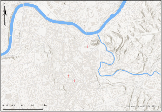 1. The South-Western foot of Gediminas Hill. 2. St. Nicholas Church. 3. Franciscan Church and Monastery.