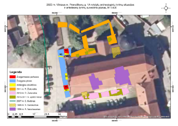 Fig. 3. Archaeological investigations in the surroundings of the Franciscan Church and Monastery. Drawing by V. Indrulėnaitė-Šimanauskienė.