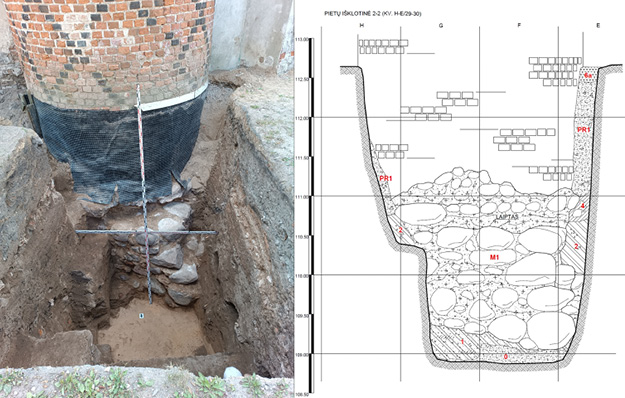 Fig. 6. Trench 2, fragment of the foundation. Photo from the North side and a drawing. Drawing by T. Dičius, photo by V. Indrulėnaitė-Šimanauskienė.