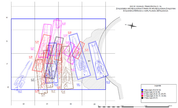 Panašiame gylyje kaip rastasis pamatas, 2 m nuo esamo žemės paviršiaus, antroje perkasoje 2023 m. buvo rasta kapų (7 pav.). Laidota net 5 horizontais, iš kurių viršutinis buvo 2 m gylyje, o apatinis 3,62 m gylyje nuo dabartinio žemės paviršiaus. Iš viso rasta 19 kapų, kurie priklausė abiejų lyčių, įvairaus amžiaus (tarp jų ir mažų vaikų) mirusiesiems. Mirusieji laidoti aukštielninki, galva į vakarus, pastebimi nedideli nuokrypiai į šiaurės vakarus ir pietvakarius (tokie nuokrypiai dažnai atsirasdavo dėl kiek skirtingos saulės padėties skirtingais metų laikais, taip pat įtakos galėjo turėti bažnyčios kryptis21). Didžioji dalis mirusiųjų laidoti mediniuose karstuose (kai kurie kontūrai buvo ryškesni, kiti ne taip aiškiai išsiskyrė). Įkapės tik kelios – smeigtukas, audinio skiautė su virvele, rūbų kabliukas, žiedas.