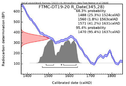 Iš duobės buvo paimti keli anglies mėginiai radiokarbono datavimui (AMS 14C, mėginio Nr. FTMC-SE06-1)19. Gauta data: 672 ± 28 BP, kalibruota data 1278–1390 m. (95,4 % tikimybė) (5 pav.). Tyrimas rodo, kad aptiktas objektas gali būti datuojamas XIV a., tačiau čia susiduriame su radiokarbono metodo problema – vadinamuoju vieno amžiaus trukmės kalibravimo kreivės suplokštėjimu (plačiau žr. Kuncevičius ir kt., 2015, p. 52). Viduramžiais šis suplokštėjimas apima visą XIV a. (nuo 1295 iki 1400 m.). Taip gautas rezultatas vienodu patikimumu rodo ir XIV a. pirmą pusę, ir jo antrą pusę. Todėl mūsų atveju tegalima konstatuoti, kad struktūra (ūkinis pastatas?) tikrai stovėjo jau XIV a.