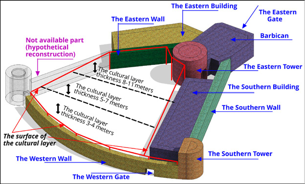 Fig. 2. 3D sketch of the Lithuanian Castle (14th–15th centuries). Thickness of soil filling in different parts of the Lithuanian Castle (reconstruction by V. Vietrov, N. Nizhnik).