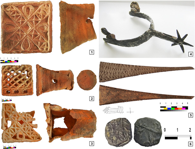 Fig. 4. Section 4.1. Gothic tile of the 15th century. Excavation, 2017. Section 4.2. Gothic slotted tile of the 15th century. Excavation, 2017. Section 4.3. Gothic lattice tile of the 15th century. Excavation, 2017. Section 4.4. A bone stylus with a graphic drawing on the back. 15th century. Excavation, 2017. Section 4.5. The spur was found near the Western Wall of the Southern Building. 14th–15th centuries. Excavation, 2017. Section 4.6. Lead seal. Found near the façade of the South Building. Excavation of 2020. Comparison of image elements with the coat of arms of Philip III the Good, Duke of Burgundy (photo by V. Vietrov).