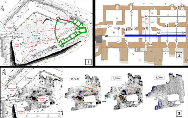 8 pav. 1 – Medžybižo pilies topografinis planas su pažymėtomis tyrimų georadaru plotų (brūkšniuota) ir atskirų profilių (raudona spalva) vietomis straipsnyje aprašytame kieme. 2 – Sieniawskių rūmų planas, kuriame pažymėti georadaro profiliai. Identifikuota konstrukcija (sienos vieta) pažymėta mėlyna spalva. 3 – Medžybižo pilies kiemo tyrimų georadaru rezultatai. Atrinkti horizontalūs pjūviai su interpretacija paaiškinti 11 pav. legendoje. Topografiniame plane pažymėti identifikuoti statiniai.