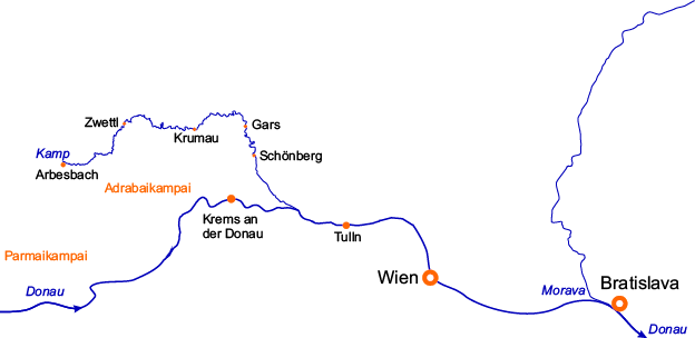 Fig. 2. The Danube, the Kamp, and the settlement areas of the Adrabaicampi and Parmaicampi. Prepared by E. Jovaiša, 2025.