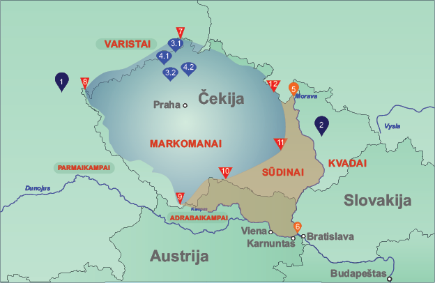 3 pav. Varistų, markomanų, parmaikampų, adrabaikampų ir kvadų gyvenamosios vietos pagal Ptolemajo „Geografiją“: 1–2. Sudetų kalnų vakarinė ir rytinė riba pagal Ch. Markso ir kitų perskaičiuotas Ptolemajo koordinates; 3–4. Bohemijos kalnų šiaurinė ir pietinė, vakarinė ir rytinė riba; 5–6. Moravos upės ištakos ir žiotys; 7–12. II amžiuje markomanų gyvenamoji teritorija istorinėje Bohemijoje ir jos kraštinės ribos (7. Lobendava, Čekija; 8. Hranice, Čekija; 9. Vyšší Brod, Čekija; 10. Slavonice, Čekija; 11. Černa, Čekija; 12. Orlické hory, Čekija). Parengė E. Jovaiša, 2025.