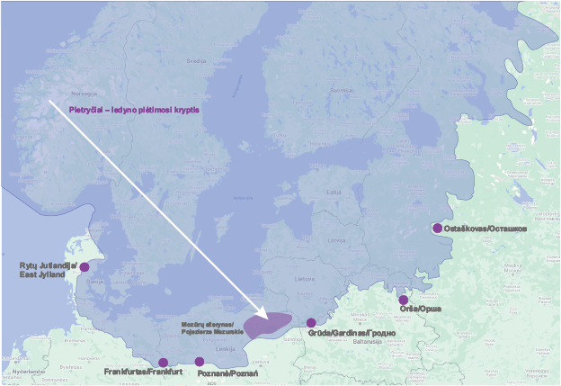4 Rengiant žemėlapį naudota: 26, Figure 1. Trečioji iliustracijos linija žymi šias kritines ribas: East Jylland, Frankfurt, Poznań, Orsha, Grūda and Ostashkov, and also Barents Ice Sheet maximum limit in the very north-east.