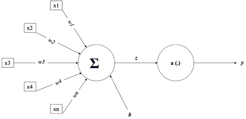 A perceptron is composed of several parts that work together to efficiently process information. External sources provide values or features to the input layer. Before being summarized by a bias term (b), each input (xi) is multiplied by its corresponding weight (wi). An activation function feeds this weighted sum and the bias term, which signals based on specific criteria or thresholds.