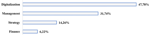 The optimization of the Moroccan SC relies on the integration of four key factors: digitization, management, strategy, and financing. The research findings indicate that digitalization plays a dominant role, accounting for 47.78% of the total effect. It is followed by the management factor, contributing 31.74%, the strategic factor at 14.26%, and finally the financial factor at 6.22%. These results clearly confirm that the adoption of I4.0 technologies offers significant opportunities to enhance the performance of the Moroccan SC.