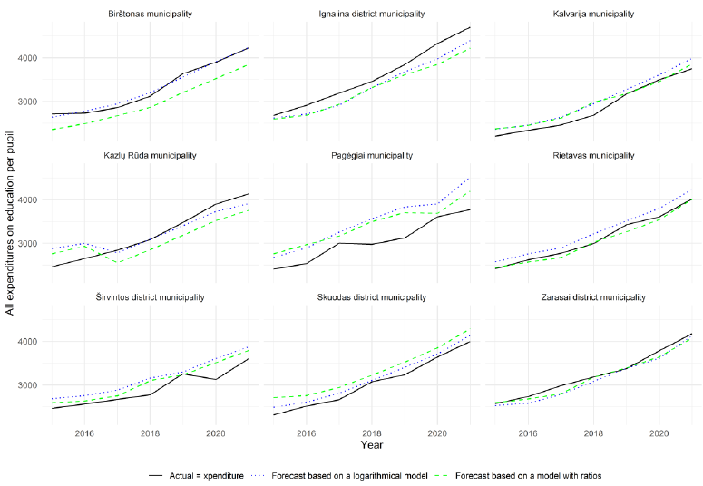 The coefficients of the equation indicate that, when comparing municipalities identical in all other characteristics, a one-percent increase in the number of pre-school pupils can be associated with a 0.22 percent rise in education costs, while a one percent increase in general education students can be associated with a 0.19 percent rise in education costs. The rise in student enrolment in the municipality of Neringa significantly affects the educational expenses there. In this municipality, a one percent rise in the number of general education pupils can be associated with a 0.28 percent increase in educational expenditure. The number of educators in Lithuanian schools is strongly tied to the number of pupils, although certain distractions from the general trend in different municipalities can, of course, arise. A one percent increase in the number of educators across all educational institutions can be associated with a 0.32 percent rise in educational expenditures. The infrastructure and inventory utilised for training purposes, along with the necessity for funding for their maintenance and service, are represented by the physical area variable. The estimation results indicate that an increase of one percent in the school area can be associated with a 0.16 percent rise in educational expenditures. These factors are the essential variables that directly determine the transfers from the central government for educational purposes, which can be directly linked to the requirement to educate a specific number of pupils, to employ the corresponding number of teachers, and to sustain the essential infrastructure. The nominal gross domestic product is one of the best indicators of the country’s overall economic situation and is the best representative of the possibility and necessity to annually index costs for all municipalities. Its estimated effect has a value of 1.05, which means that a one percent increase in nominal GDP is associated with slightly over a one percent increase in educational spending overall in the country. This finding is in line with the fact that spending for educational purposes in Lithuania grew up a little faster than for other purposes in recent years: a one percent increase in the nominal income in the country results in an average expenditure growth of 1.05 percent on education. The indicator of municipality added value, which illustrates the disparities among individual municipalities and their respective capacities for enhanced education funding, indicates that municipalities creating greater added value tend to exhibit marginally elevated educational expenditures – specifically, a one percent increase in added value can be associated with a 0.06 percent rise in educational spending. The final factor, the 2021 dummy, reflects the decision to provide significant funding for educational needs in 2021, despite the COVID-19 pandemic’s negative economic impact on the results in the year 2020.