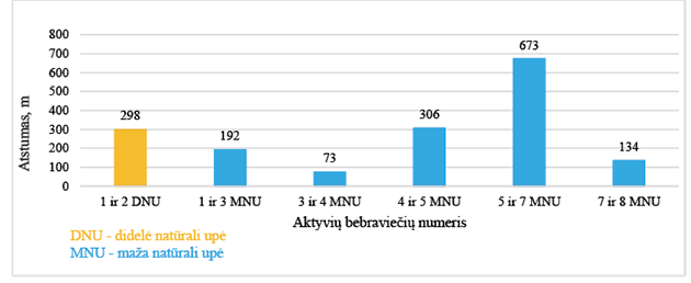 Nustačius atstumus tarp aktyvių bebraviečių, išsiaiškinta, kad mažiausias atstumas yra 73 metrai, o didžiausias – 673 metrai (žr. 4 pav.). Atstumų vidurkis MNU yra 276 metrai, o tarp visų aktyvių bebraviečių – 279 metrai. Šis, vidutinis, atstumas yra panašus į atstumą tarp dviejų aktyvių bebraviečių DNU, kuris yra 298 metrai. Nustatytas atstumas atitinka Ulevičiaus (2008) pastebėjimą, kad vidutinis populiacijos tankumas skirtingose Lietuvos teritorijose svyruoja nuo 0,2 iki 3,0 bebravietės 1 km.