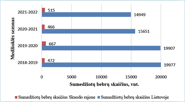 Remiantis sumedžiotų bebrų skaičiais per paskutinius ketverius metus (žr. 1 pav.), galima teigti, kad 2018–2019 ir 2019–2020 metų medžioklės sezono laikotarpiu sumedžiotų bebrų didesnis skaičius lėmė mažėjančią jų populiaciją ne tik Skuodo rajone, bet ir visoje Lietuvoje.