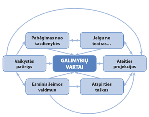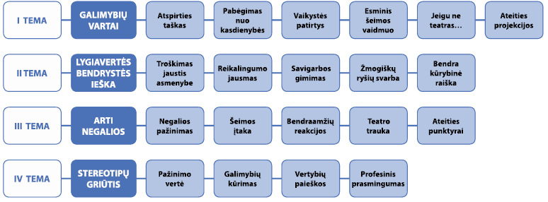 Šią temą sudaro 6 potemės: Atspirties taškas, Pabėgimas nuo kasdienybės, Vaikystės patirtys, Esminis šeimos vaidmuo, Jeigu ne teatras…, Ateities projekcijos (2 pav.).