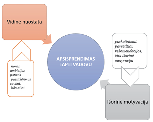 Iš informantų atsakymų galima suprasti, kad vidiniam asmens sprendimui pasirinkti vadovo profesinę karjerą didesnės įtakos turėjo įvairūs išoriniai veiksniai (pvz., asmens patirtis su buvusiais vadovais bei noras inicijuoti pokyčius sistemoje), nei vidinės ambicijos ir noras būti vadovu. Vadovui norisi būti pastebėtam ir įvertintam – tai skatina priimti ryžtingus sprendimus, motyvuoja pokyčiams ir karjerai.