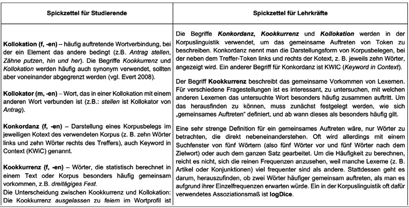 Zusätzlich zu den korpusbasierten Übungsaufgaben wird ein Glossar mit wichtigen korpusbezogenen Begriffen und kurzen Definitionen, das die Arbeit mit korpuslinguistischen Werkzeugen und Ressourcen im Unterricht erleichtern soll, als sogenannter „Spickzettel“ zur Verfügung gestellt. Um Korpuskompetenzen an Studierende vermitteln zu können, müssen Lehrende zuerst selbst eine ausreichende Korpuskompetenz erlangen. Damit der Einsatz korpusbasierter Übungen nicht nur für die Lernenden, sondern auch für ihre Dozierenden erleichtert wird, existiert der „Spickzettel“ in zwei Versionen: Zum einen mit der Zielgruppe der Studierenden, die darauf im Unterricht oder bei der Nachbereitung eine prägnante, niedrigschwellige Definition korpusbezogener Fachbegriffe nachschlagen können. Zum anderen wird eine erweiterte Version zur Verfügung gestellt, die sich an Lehrende richtet und weiterführende Hintergrundinformationen zu den thematisierten Begriffen und Konzepten anbietet. Die Bereitstellung von zwei verschiedenen Versionen bietet den Vorteil, dass der „Spickzettel“ für die Studierenden übersichtlich bleibt und nicht mit (interessanten, aber sprachlich und wissenschaftlich komplexen) Informationen überfrachtet wird. Der „Spickzettel“ für die Lehrenden bietet genau solche Informationen, die es erleichtern sollen, beispielsweise auf tiefer gehende Nachfragen von Studierenden reagieren zu können.