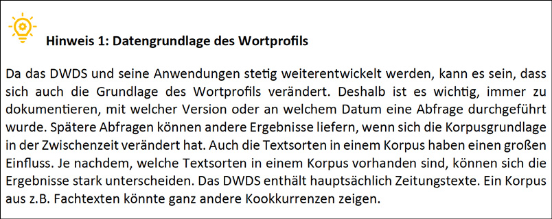 Abbildung 1. Hinweisbox zur Datengrundlage des DWDS-Wortprofils