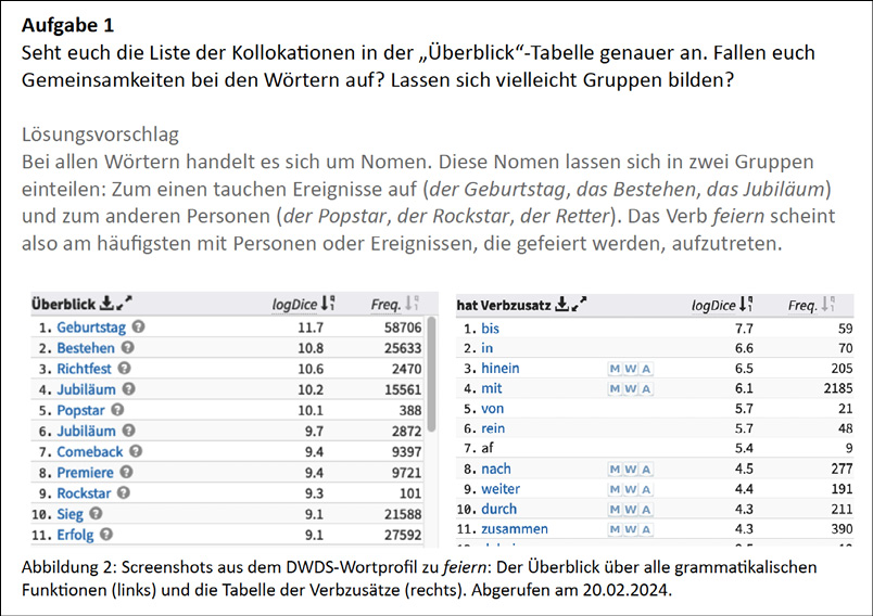Im Anschluss an Aufgabe 3 wird das zuvor besprochene Wortprofil von feiern mit dem von Fest kontrastiert (Tabelle 1).