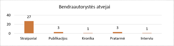 Bendrautorystė. Iš viso ٢٠١٣–٢٠٢٣ m. žurnale Knygotyra nepaisant žanro publikavosi 212 autorių. Įskaitant visus žurnalo Knygotyra 2013–2023 m. tekstų žanrus nustatyti 35 bendraautorystės atvejai (žr. 4 pav.), jų skaičius lyginant su 2000–2011 m. atlikto tyrimo duomenimis išaugo 60 proc. Santykis su visais atitinkamo žanro rašiniais rodo, kad kelių autorių straipsniai sudaro apie 15 proc., trečdalis publikacijų tekstų parašyta kelių autorių, pusė pratarmių ir vienintelis interviu tekstas dviejų autorių bei vienas iš 22 „Kronikos“ pranešimų trijų autorių. Žurnale Knygotyra Lietuvos autorių paskelbtų mokslinių recenzuojamų straipsnių yra 5 proc. nuo visų tokių autorių paskelbtų straipsnių, o tarp užsienio mokslininkų tokių straipsnių yra 23 proc. Kaip buvo pastebėta, 2010–2012 m. nebuvo nei vieno tarptautinės bendraautorystės atvejo28, 2013–2023 m. žurnale tokių atvejų padaugėjo 300 proc. Apskritai Lietuvos autoriai, rašantys straipsnius žurnale Knygotyra, mažiau nei užsienio autoriai yra linkę į bendraautorystę. Nepaisant to, devyni straipsniai publikuoti su bendraautoriais, aštuoni parašyti dviejų bendraautorių (iš kurių trys kartu su užsienio autoriais), vienas trijų bendraautorių. Daugiaautorių straipsnių yra tarp tų, kurie parašė po vieną ar du straipsnius. 23 straipsniai, arba arti trečdalio visų užsienio autorių straipsnių, parengti ne vieno autoriaus. Dažniausiai straipsnių autorystę dalinasi dviese, tačiau yra keli straipsniai, kuriuos parašė trys arba penki autoriai. Apibendrinus Lietuvos autorių ir užsienio autorių paskelbtų kelių autorių straipsnių duomenis galima teigti, kad didžiule persvara bendraautorystė dažnesnė užsienio autorių straipsniuose.