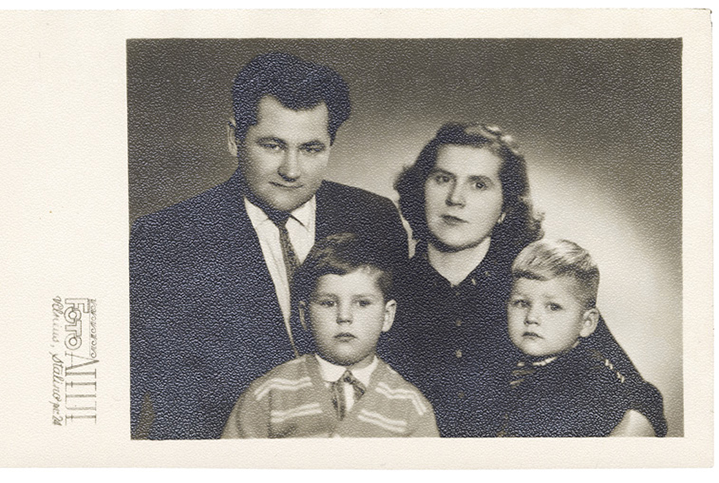 Jauna šeima. Vladas ir Eleonora (Vasiliauskaitė) Žukai, ant kelių – sūnūs Saulius ir Vaidotas. Vilnius, Stalino prospekto fotoateljė. VUB RS.