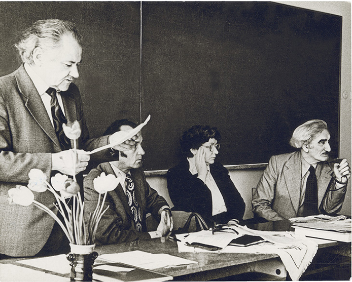 Absolventų diplominių darbų gynimo komisija. Iš kairės: Vladas Žukas, Vincas Auryla (filologas), Genovaitė Raguotienė, Levas Vladimirovas. 1980 m. D. Kauno nuotr.