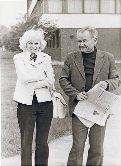 Martyno Mažvydo knygos bičiulių klubo narių grupė išvyksta į Bitėnus steigti Martyno Jankaus memorialinės ekspozicijos. Nuotraukoje – dailininkė Ieva (Evė) Labutytė ir klubo pirmininkas V. Žukas. 1981 m. D. Kauno nuotr.