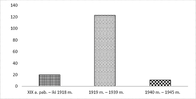 Chronologija ir leidybos statistika. Beveik visi peržiūrėti leidiniai turi nurodytas leidybos datas. Tik keletas jų (humoristiniai, nelegalūs) datavimo neturi. Ankstyviausias nustatytas leidinys – tai Peterburge veikusių baltarusių studentų liaudininkų nelegalaus žurnalo baltarusių ir rusų kalbomis Гомон: Белорусский социально-революционный обзор50 antrasis (ir kartu paskutinis) numeris, išleistas ir padaugintas hektografu 1884 m. lapkričio 15 d. Žinoma, kad jį leidę asmenys palaikė glaudžius ryšius su Vilniuje, Kaune, Gardine, Minske, Vitebske veikusiais liaudininkais. Kitas ankstyvas leidinys, išleistas Lietuvos teritorijoje, – tai Kaune 1905 m. lapkričio 11 ir gruodžio 7 d. Kauno gimnazijoje veikusios Lenkų korporacijos šapirografu išleisti jau minėto rankraštinio laikraštėlio Glos Młodeźy. Pismo Korporacji Polaków Kowieńskiego gimnazyum, poświęcone głownie sprawom uczniowskim, a też politycznym i społecznym51 du pirmi numeriai. Vėlyviausias – tai 1946 [?] m. pogrindyje šapirografu padaugintas rankraštinis, nenumeruotas leidinys Pavergtos tautos šauklys52. Visus rinkinio leidinius leidybos istorijos aspektu galime suskirstyti į tris stambius chronologinius laikotarpius, susietus su Lietuvos istorija53 (1 diagrama). Pirmasis apima nuo XIX a. pabaigos iki 1918 m., kai buvo sukurta pirmoji Lietuvos Respublika. Šiam laikotarpiui priskiriame 20 pavadinimų. Antrasis etapas apima Nepriklausomos valstybės metus, 1918–1939 m. imtinai. Šiuo metu buvo išleisti net 123 laikraštėliai. Trečiasis laikotarpis apima pirmosios sovietų okupacijos ir Antrojo pasaulinio karo metus, 1940–1945 m. Rinkinyje užfiksavome 11 pavadinimų to meto leidinių. Šie statistiniai duomenys atliepia profesionaliosios periodikos spaudos dinamiką.