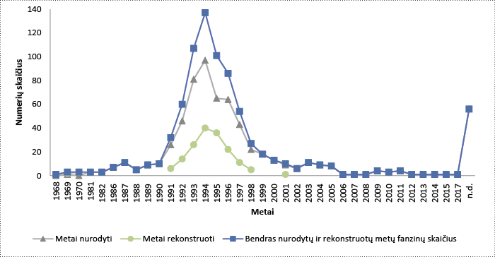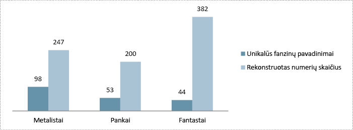 38 Kadangi ne visi fanzinų numeriai pateko į „Lietuvos zinų kolekcijos“ ir papildomai surinktus išteklius, analizei atrinktų numerių skaičius buvo rekonstruotas remiantis paskutinio žinomo to paties pavadinimo fanzino numerio skaičiumi ir apklaustų pateikėjų duomenimis.