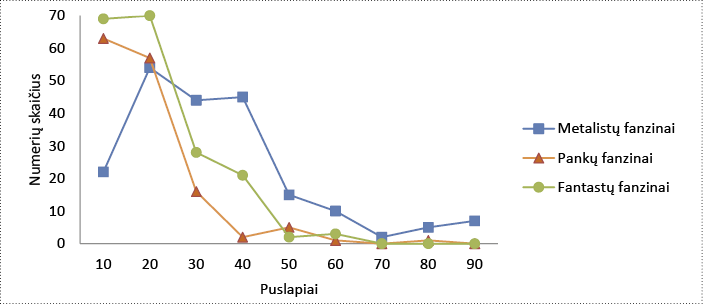 Kaip galima pastebėti, XX a. pabaigos – XXI a. pradžios Lietuvos alternatyvaus jaunimo leistų fanzinų apimtis skyrėsi. Analizei surinktų išteklių metaduomenys rodo, kad didžiausias fanzino puslapių skaičius būdingas metalistų kurtiems leidiniams (žr. 4 pav.).